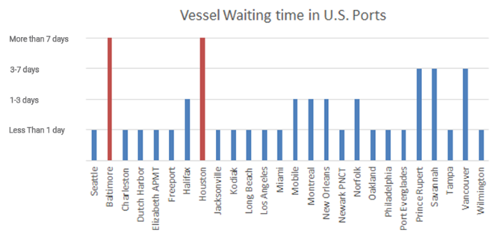 • Empty container volumes remain healthy within the US and Canada. There is less congestion within the rail and truck networks, which is helping with positioning empties as needed. Maersk seeing less congestion within depots and terminals and reduced waiting time across North America with many terminals at zero days waiting time. W Hydroclloids, Inc. currently utilizes the following US ports: Los Angeles, Norfolk, Charleston, Houston, Ohio, Oakland, and New York.